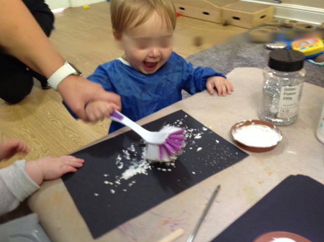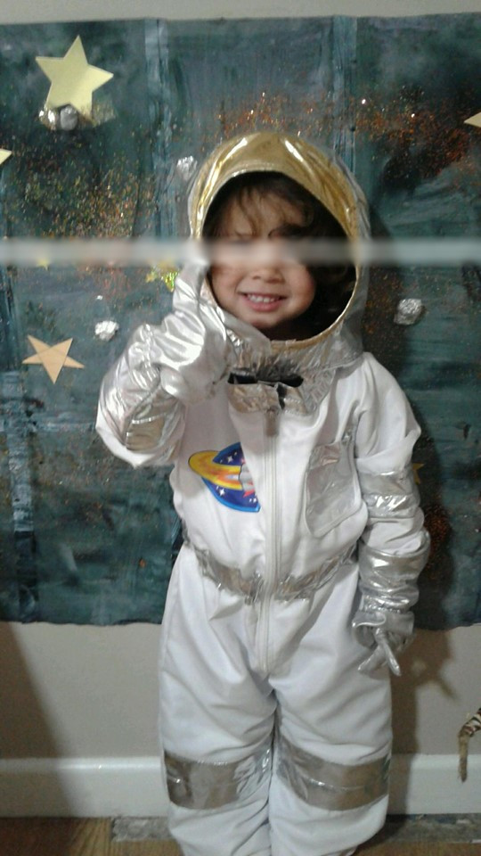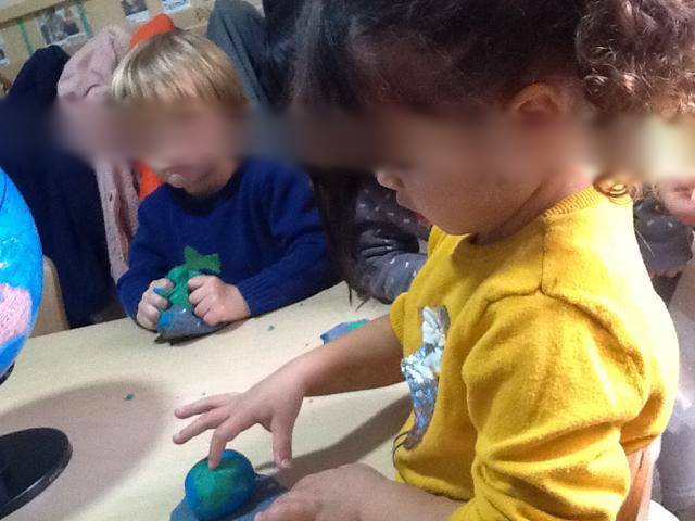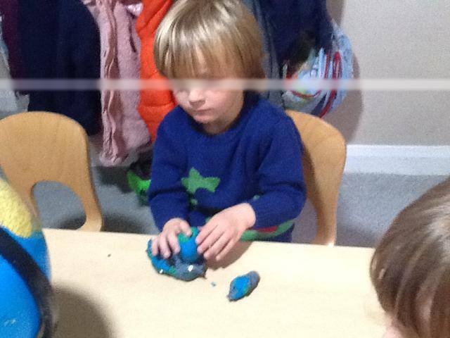 The children enjoyed making playdough with black paint and silver glitter (for the night sky/stars/space). They also used blue and green paints to mix together (for the world). Using the Globe for visual representation of the planet earth the children used the green and blue shapes to create their own interpretation of the planet earth with varying and interesting views. The children seemed to enjoy this activity and it helped their understanding in many ways about what goes on in Space and what Astronauts do. One child rolled out the black playdough, then placed their ball of blue and green in the middle; they said “this is the world in the sky in space.”